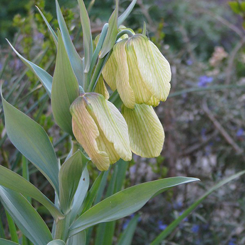 This rare Central Asian native has a growing habit similar to F. Crown imperialis rubra maxima, but is a bit more delicate in appearance. It has a cluster of up to 20 pendant, bell-shaped, pale greenish-yellow flowers under a tuft of upright shiny foliage atop a rigid, strong stem. It also has delicate interior beauty with hazy, green-edged white nectaries that appear like little eyes. Occasionally, some flowers elevate to be outward facing. Full to dappled sunlight. 24″ to 32″